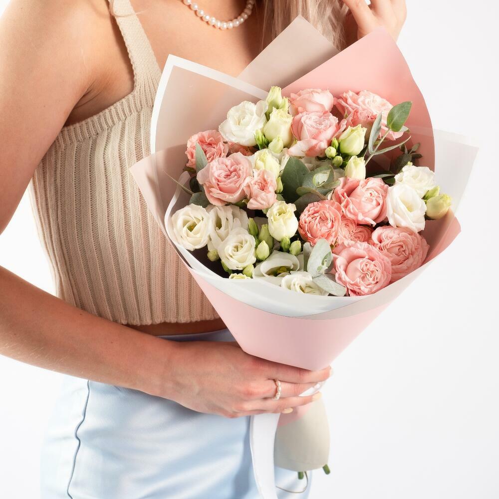 Красивое соцветие миниатюрных бутонов кустовой розы и эустомы делают этот букет прекрасным подарком по-любому поводу. Силикатный окрас позволяет сочетать кустовую розу с практически любым цветком. Данный букет собран для вас в классическом стиле, в нежной упаковке. Дарите улыбки своим близким, а мы вам в этом поможем