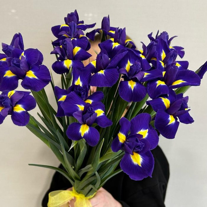 Букет из 19 фиолетовых ирисов в ленте