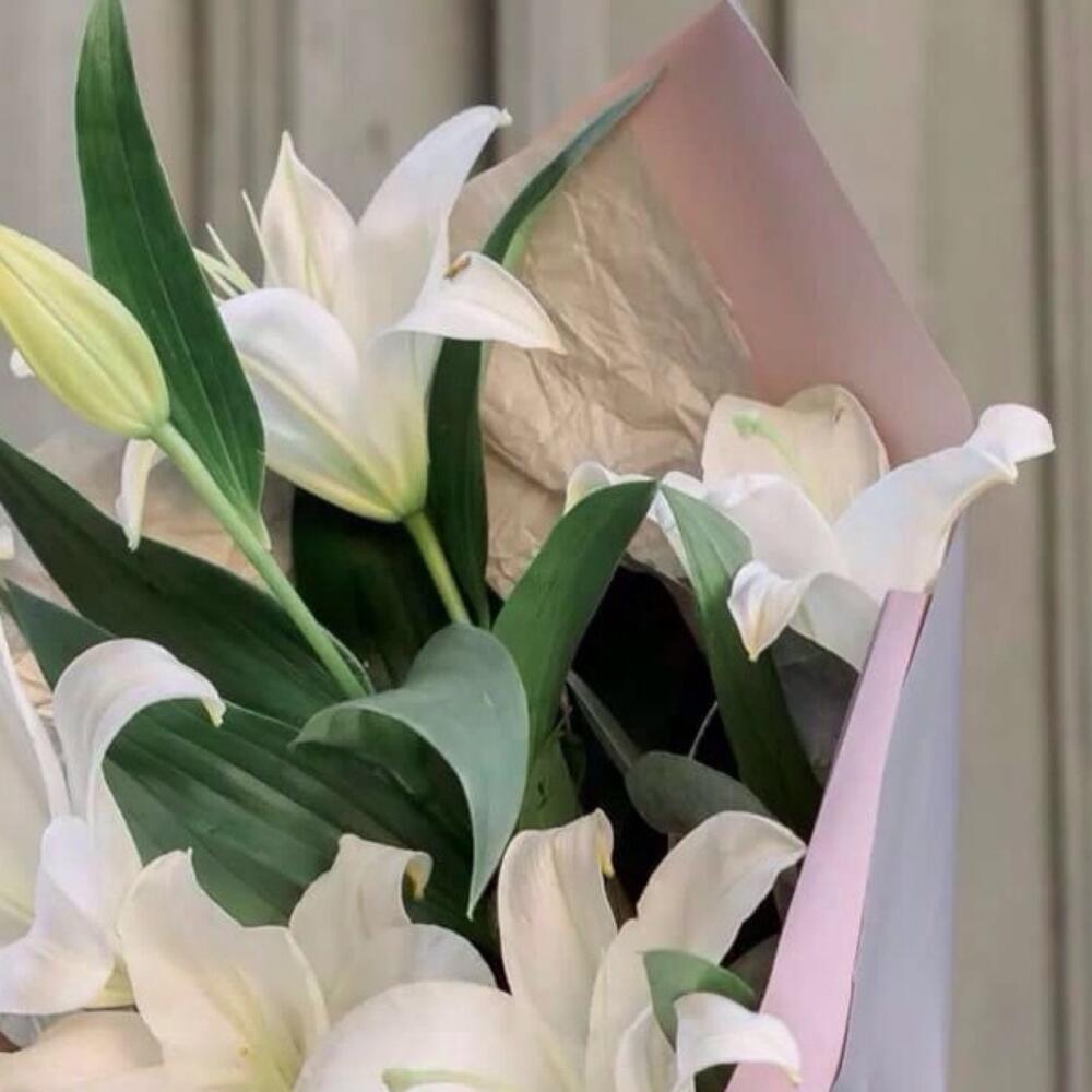 Лилия – 3 шт.Лента атласная – 2 шт.Упаковка дизайнерская – 2 шт.