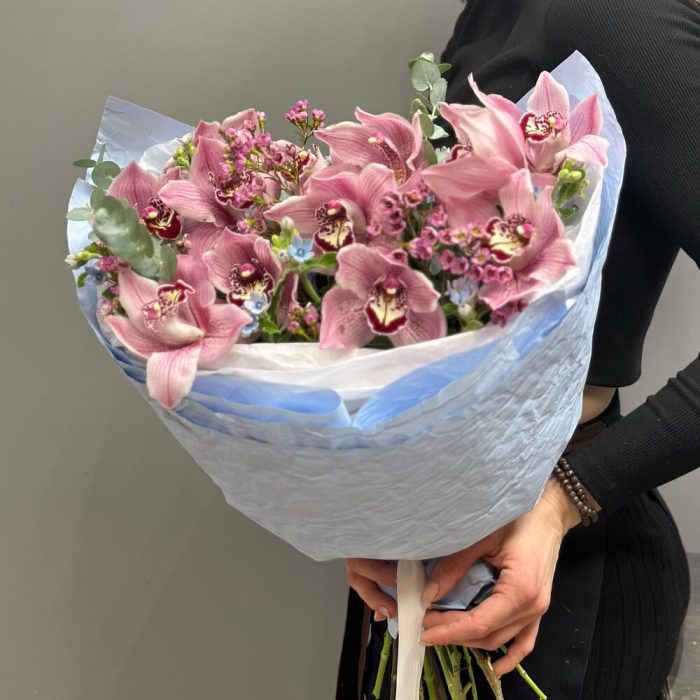 Ваксфлауэр – 2 шт.Эвкалипт – 1 шт.орхидея – 13 шт.Оксипеталум – 9 шт.Упаковка дизайнерская – 1 шт.