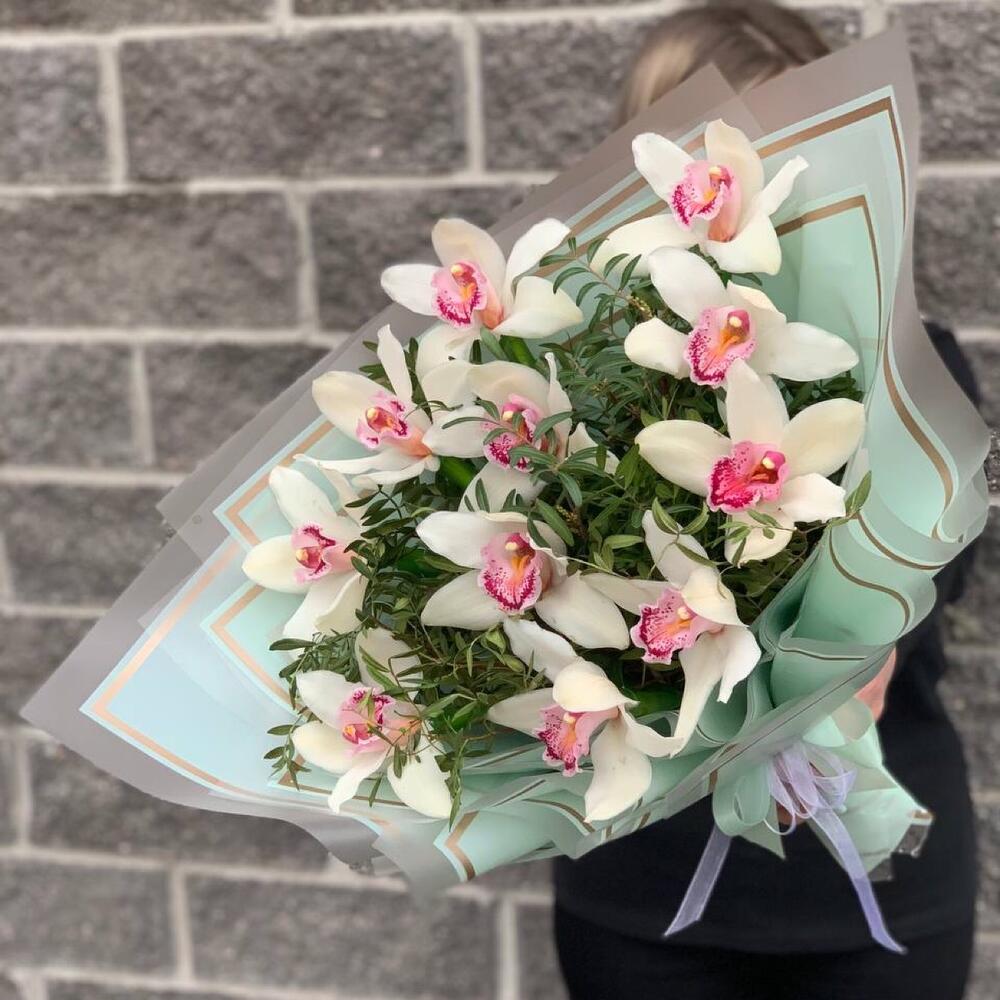 Орхидея Цимбидиум – 11 шт.Зелень – 10 шт.Упаковка дизайнерская – 2 шт.Лента атласная – 2 шт.