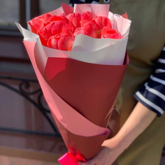 7 пионов Коралл Шарм в дизайнерской упаковке