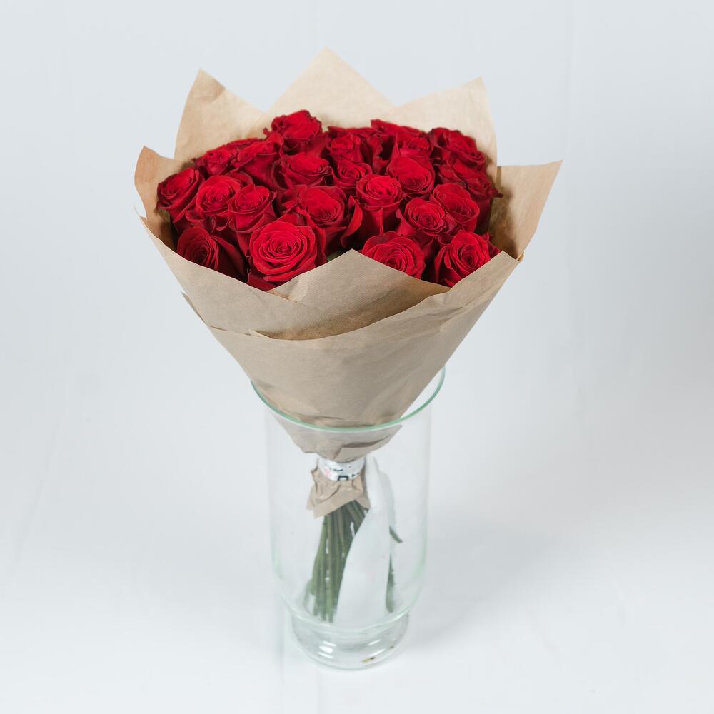 Роза красная 50 см эквадор – 25 шт.Крафт дизайнерский – 1 шт.Лента атласная – 1 шт.