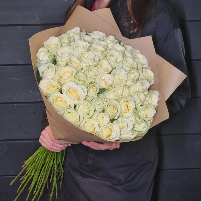 Роза 60 см – 51 шт.Крафт упаковка – 1 шт.Лента атласная – 1 шт.