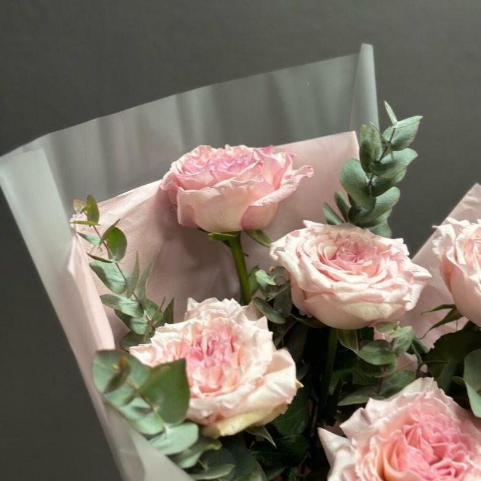 Эвкалипт – 2 шт.Лента атласная – 1 шт.Тишью – 2 шт.Пленка дизайнерская – 2 шт.роза пинк охара(ароматная) – 5 шт.