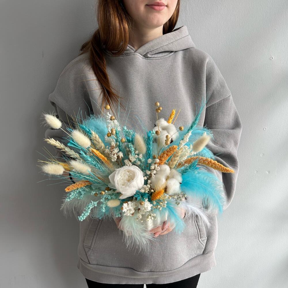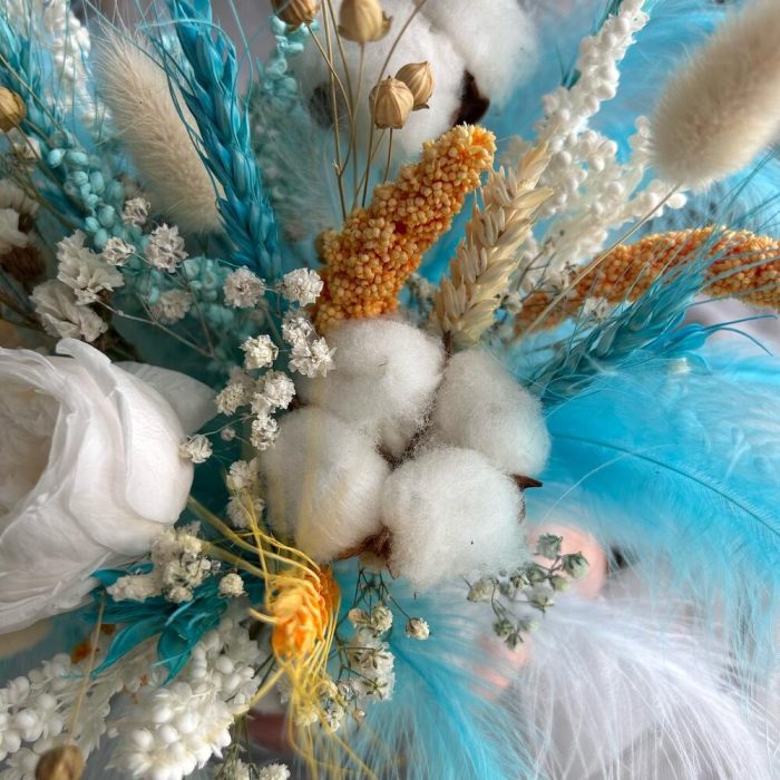 Гипсофила – 1 шт.Статица белая – 1 шт.Нигелла – 1 шт.Лен – 3 шт.Кашпо керамическое – 1 шт.Оазис флористический – 1 шт.Хлопок натуральный – 2 шт.Лагурус (сухоцвет) – 7 шт.Пшеница (сухоцвет) – 13 шт.роза пионовидная стабилизированная – 1 шт.перья декоративные – 23 шт.сетария сухоцвет – 3 шт.сорго стабилизированный – 8 шт.