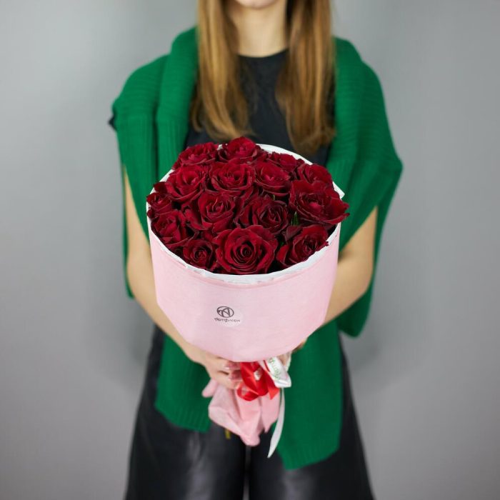 Букет 15 красных роз в розовой упаковке