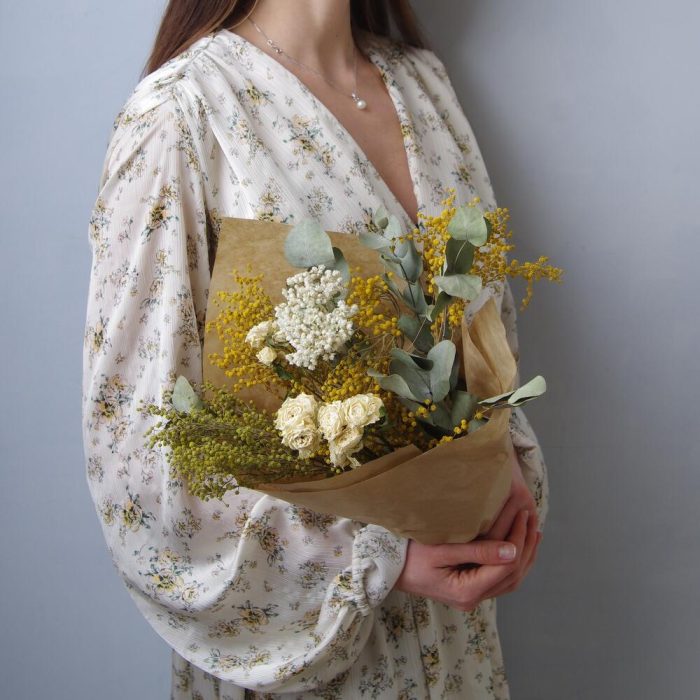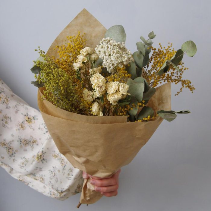 кустовая роза сухоцвет – 3 шт.озотамнус сухоцвет – 1 шт.эвкалипт сухоцвет пучок – 1 шт.мимоза пучок сухоцвет – 1 шт.Крафт упаковка – 1 шт.транспортировочная упаковка – 1 шт.