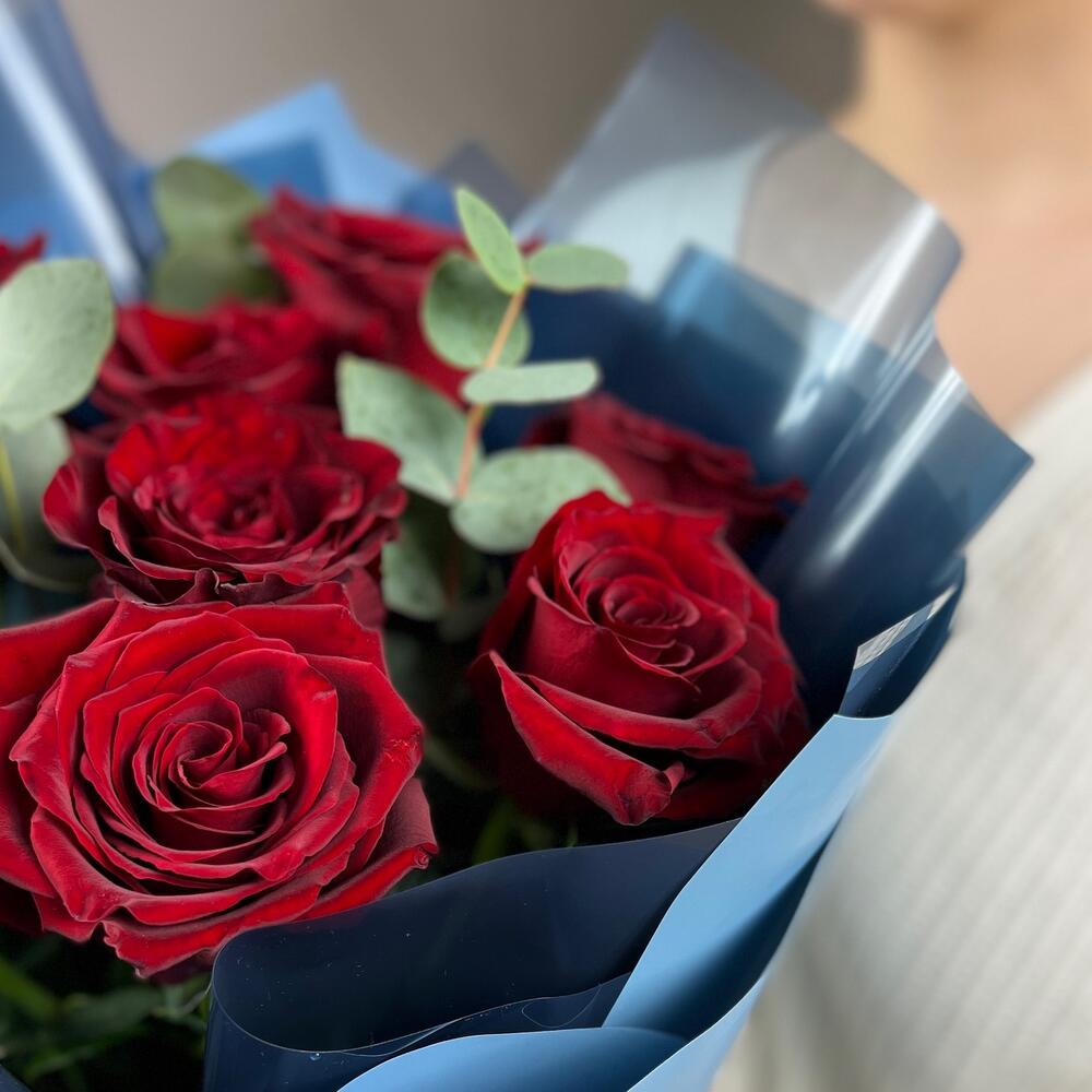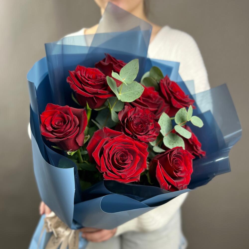 Букет из 9 бордовых роз с эвкалиптом