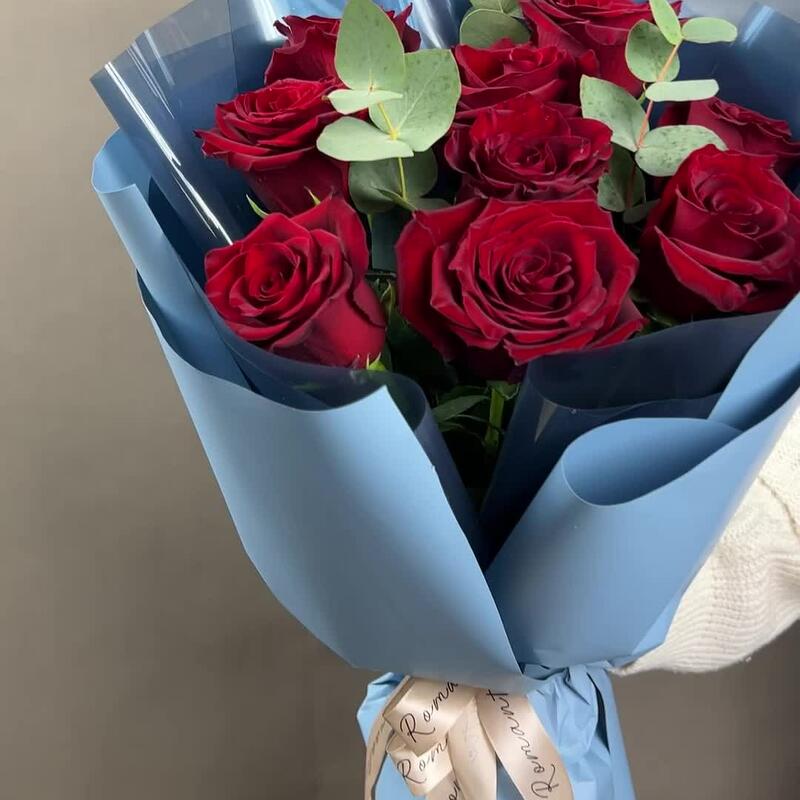 Эвкалипт – 3 шт.Лента атласная – 2 шт.Пленка матовая – 5 шт.Роза эксплорер 50 см – 9 шт.пленка полупрозрачная – 4 шт.