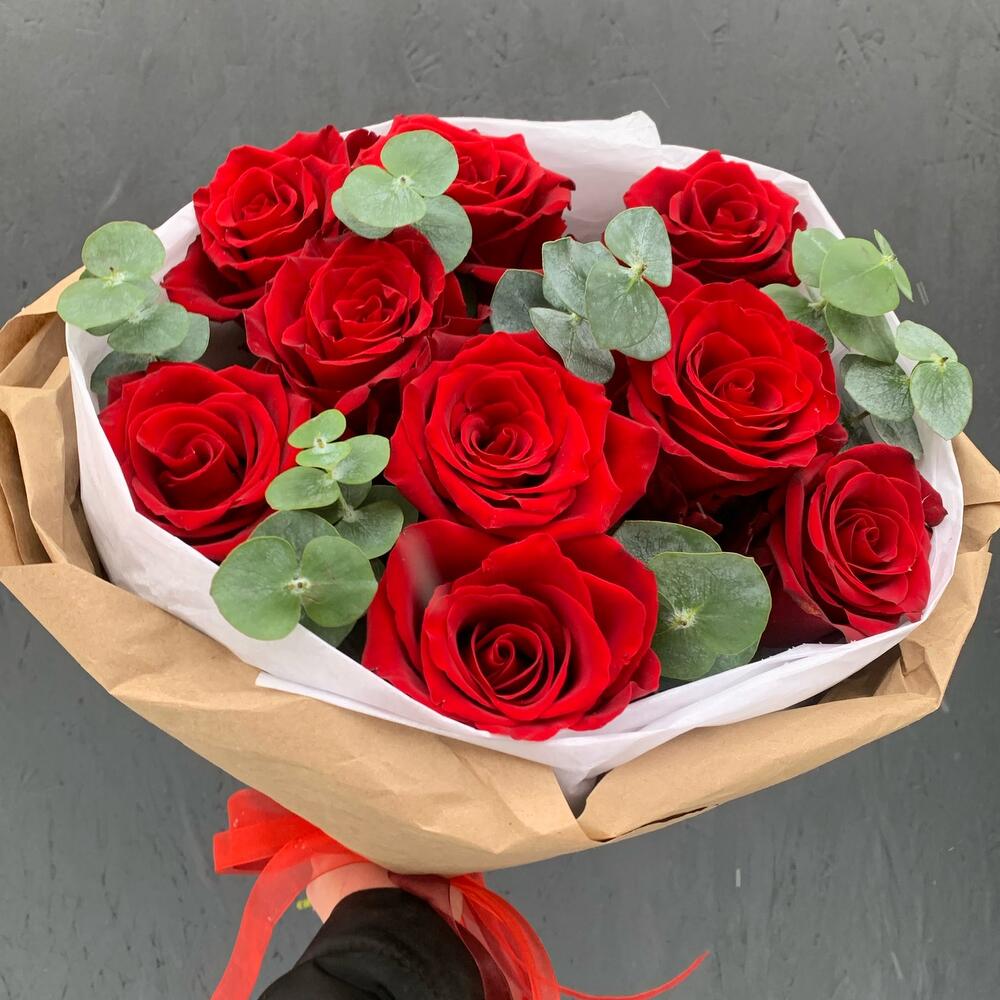 Букет из 9 красных роз с эвкалиптом