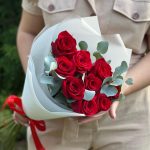 Роза фридом 50 см – 9 шт.эвкклипт – 3 шт.Тишью – 1 шт.Дизайнерская упаковка – 1 шт.