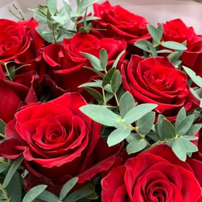 Букет из красных роз и ароматного эвкалипта