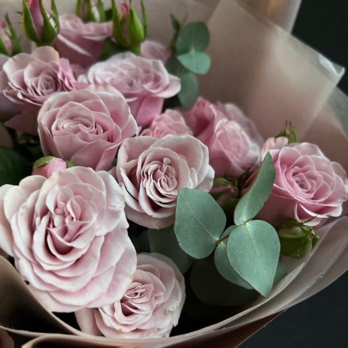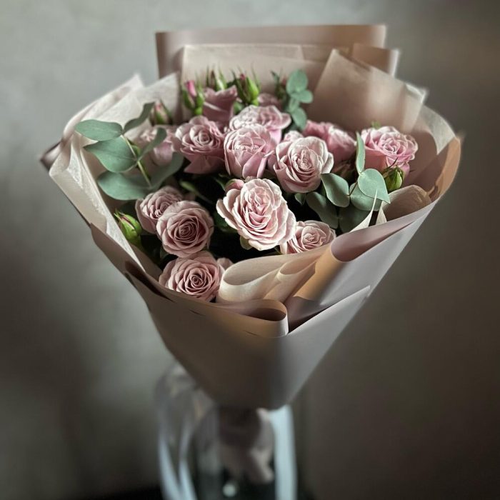 Кустовая роза – 5 шт.Эвкалипт – 3 шт.декоративная упаковка – 1 шт.Атласная лента – 1 шт.
