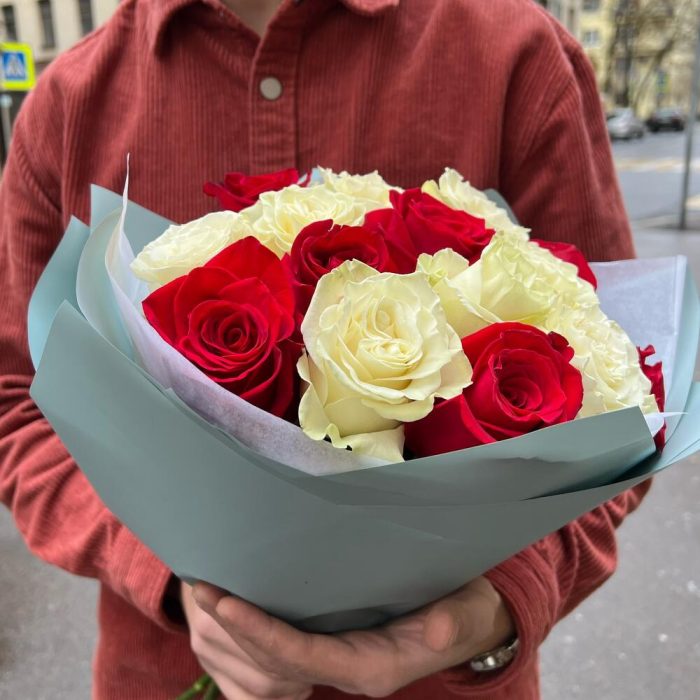 Букет с красной и белой розой 15шт