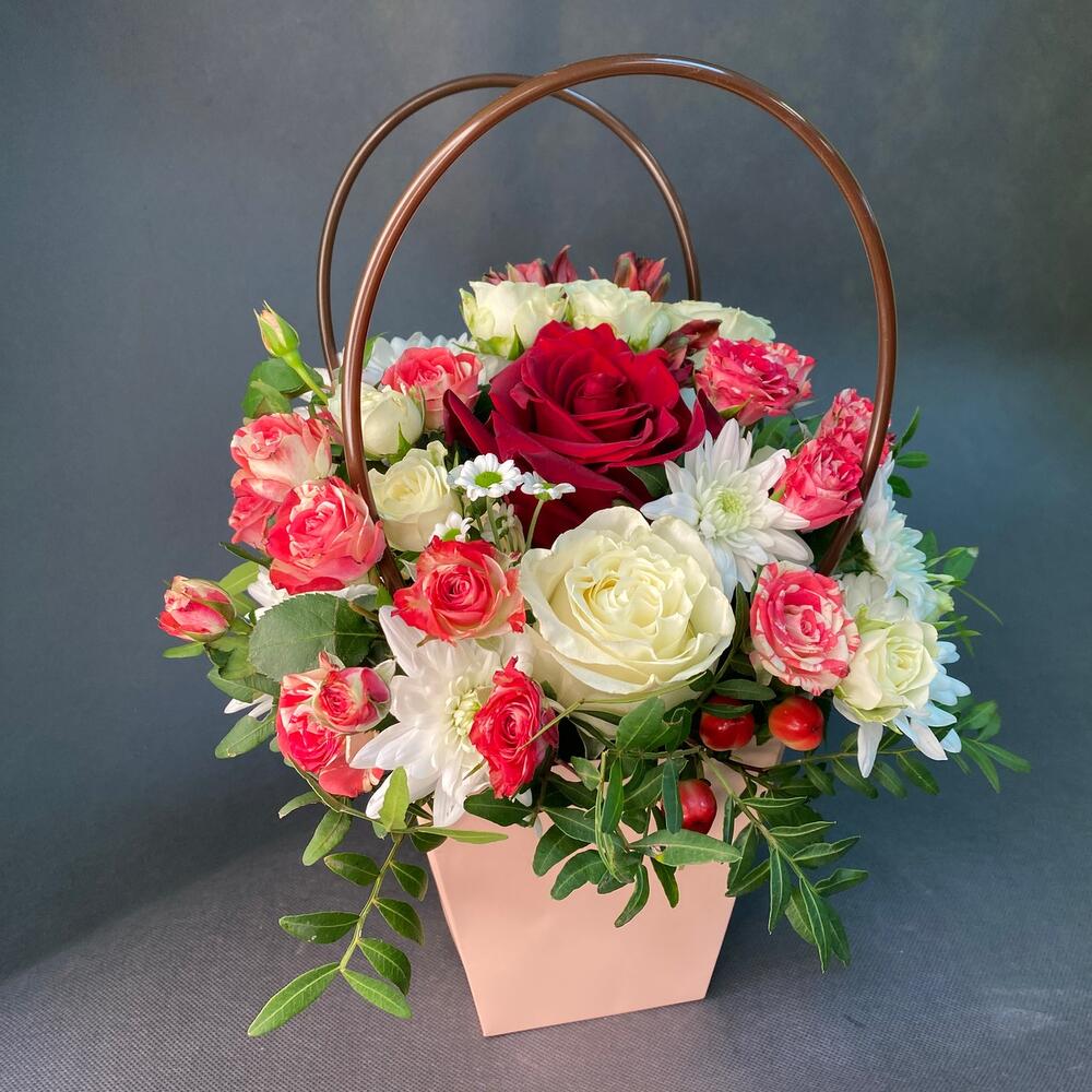 Роза Эквадор – 3 шт.Роза кустовая – 4 шт.Хризантема кустовая – 2 шт.Альстромерия – 1 шт.зелень декоративная – 9 шт.Сумочка с ручками из плотного картона ламинированого – 1 шт.
