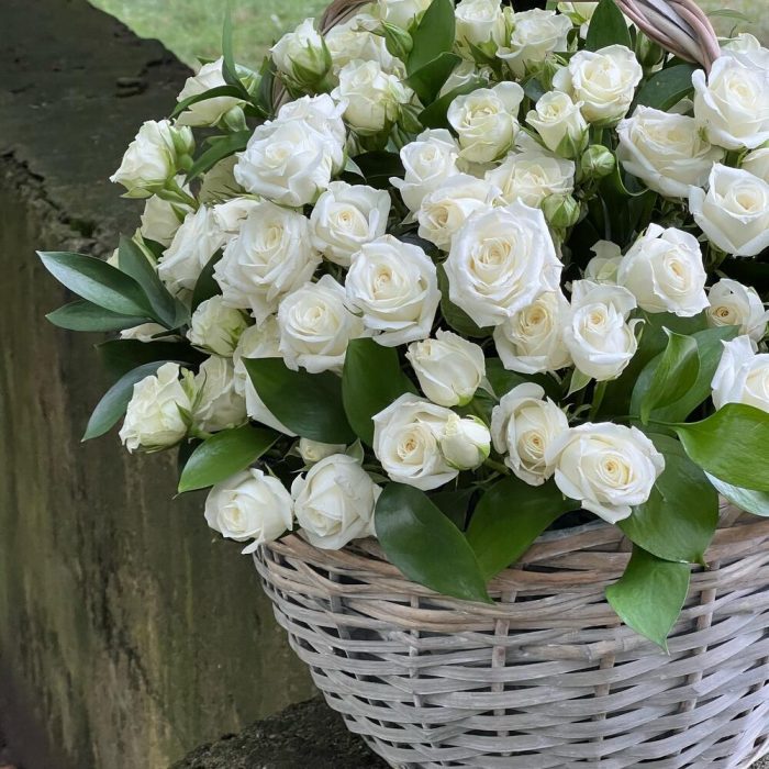 Рускус – 15 шт. Роза кустовая – 25 шт. Корзина плетеная – 1 шт.
