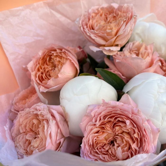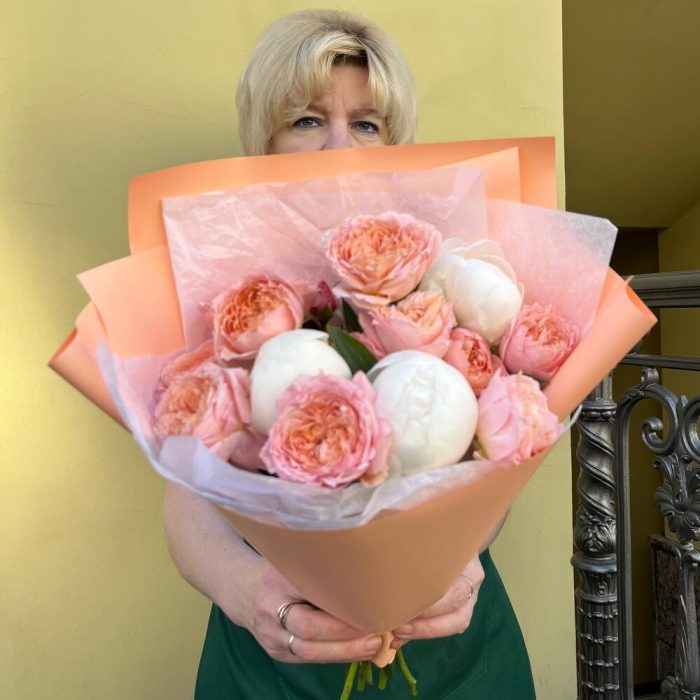 Пион белый – 3 шт.тишью белоснежное – 1 шт.упаковка корейская пленка персиковая – 1 шт.премиум пионовидных роза джульетта – 4 шт.