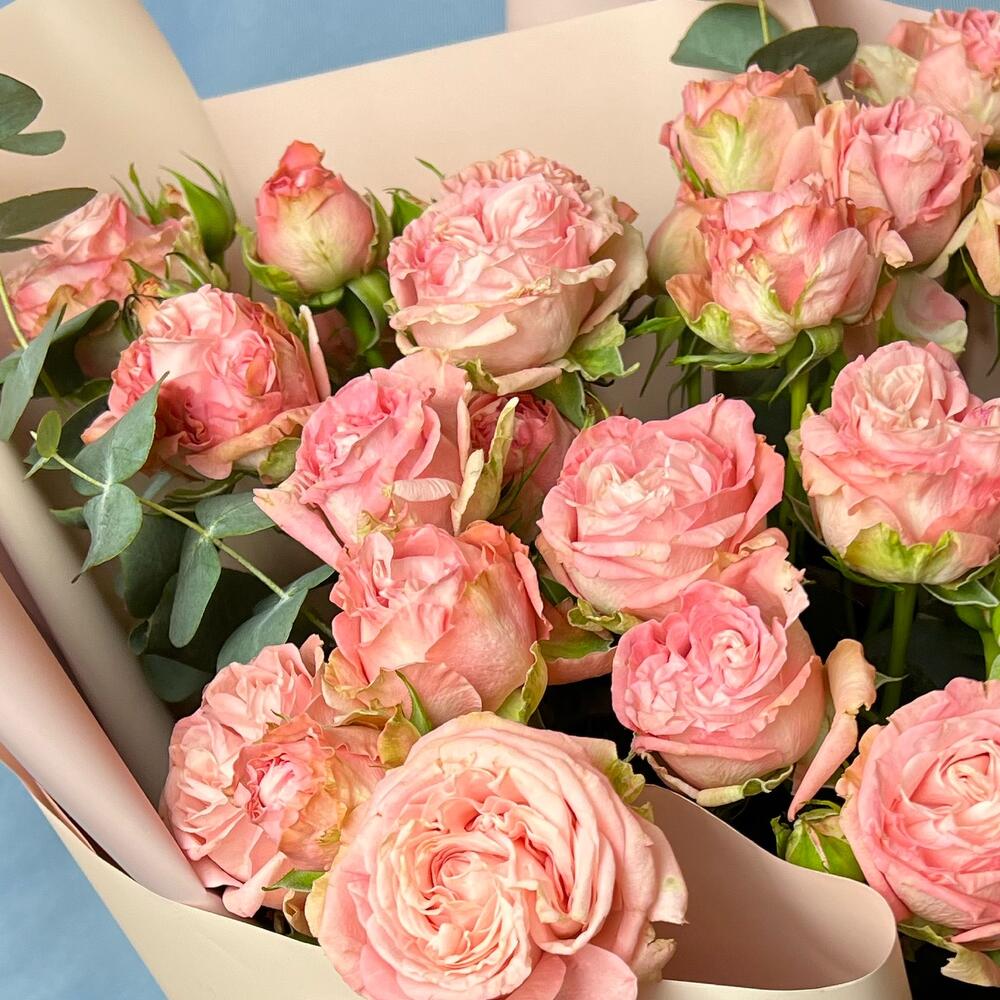Эвкалипт – 2 шт.Кустовая пионовидная роза – 5 шт.Упаковка дизайнерская – 1 шт.комплимент от polyanka – 1 шт.
